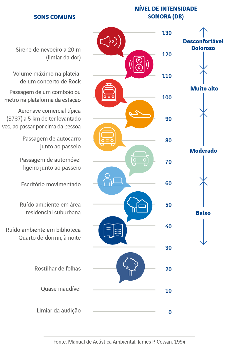 Os níveis sonoros são medidos em decibéis (dB), numa escala logarítmica, onde 0 dB é considerado o "limiar de audição" (o nível de ruído mínimo que o ser humano normal é capaz de ouvir) e 120 dB é, nominalmente, o "limiar de dor" (o nível de ruído a partir do qual o ouvido humano começa a sofrer danos físicos).