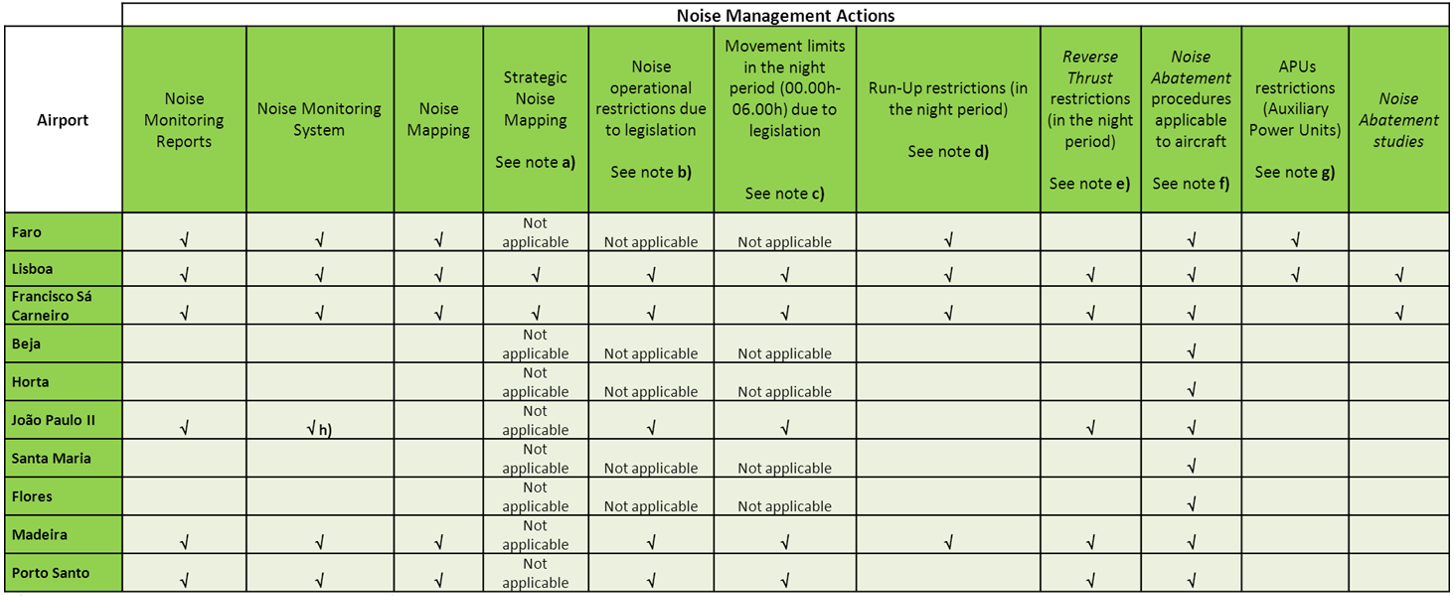 Encontrando-se, por um lado, os Planos de Ação associados às Grandes Infraestruturas de Transporte Aéreo formalizados pelas disposições legislativas aplicáveis, por outro, a gestão do ruído é transversal às restantes infraestruturas aeroportuárias, sendo que existem medidas que visam controlar e minimizar os impactes ambientais associados às emissões de ruído da sua atividade implementadas em todos os aeroportos.
